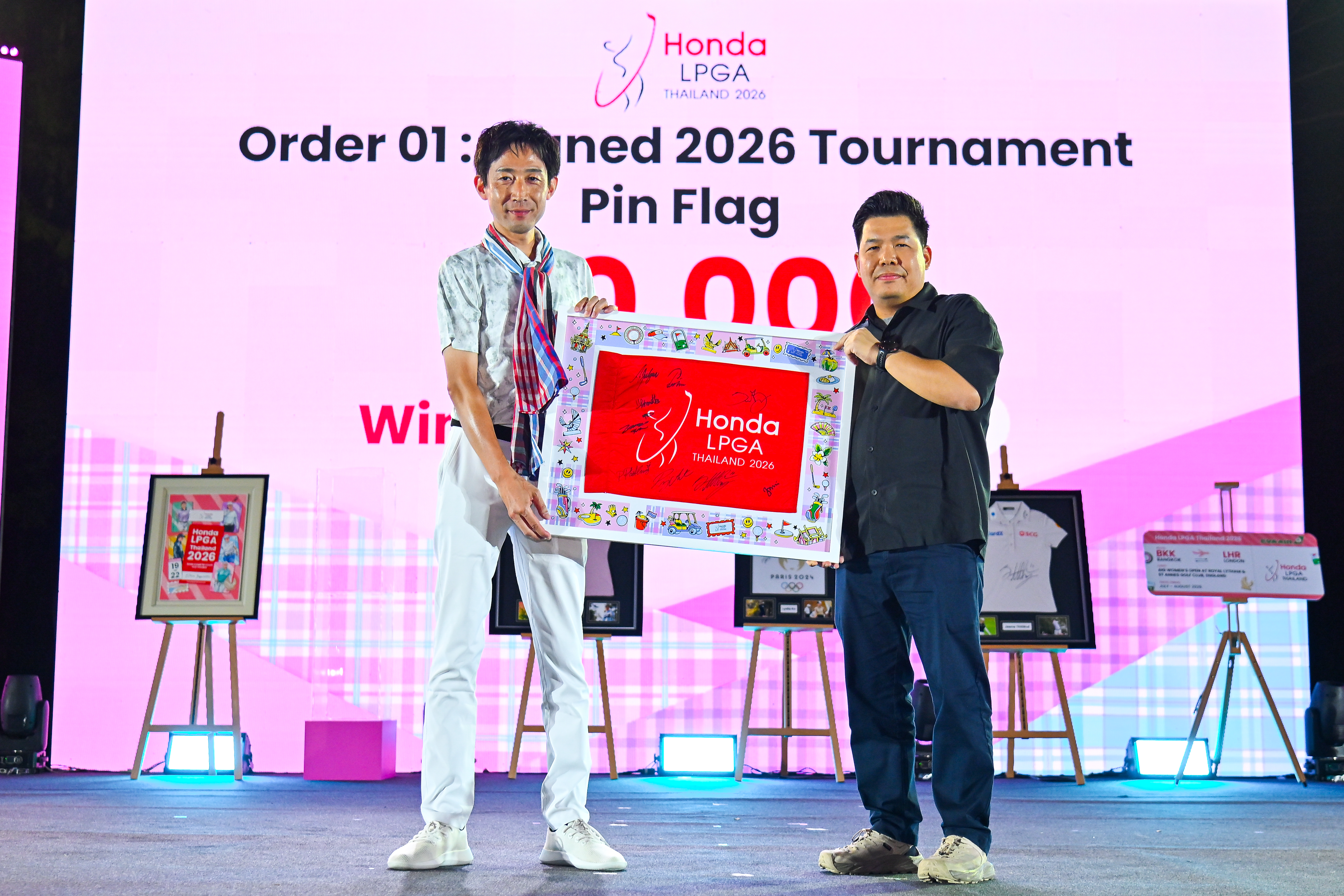 โปสเตอร์ลิมิเต็ดเอดิชั่นปี 2026 ถ่ายทอดภาพ 5 นักกอล์ฟระดับโลกพร้อมลายเซ็น ได้แก่ จีโน่-อาฒยา ฐิติกุล, แองเจิล หยิน, รัว หนิง หยิน, อากิเอะ อิวาอิ และลินน์ กรานท์ ผลงานจาก Taraya Artwork ผู้ชนะการประมูล ได้แก่ คุณซอรัฟ โจติ ประธาน บริษัท ไซการ์ เทรดดิ้ง จำกัด ถูกประมูลไปในราคา 160,000 บาท